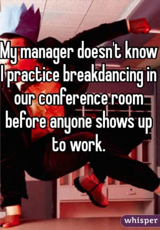 Here is a pretty funny message am anonymous poster wrote online. They say that no one has (yet) discovered that every morning, before the other employees get to work, they practice and try to perfect their secret breakdancing moves.
