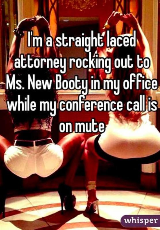 Here is a funny message, posted by a "straight-laced" attorney. They said that quite often, during their conference calls, they are freely rocking out to songs by rapper Ms. New Booty, without their clients and coworkers noticing anything.