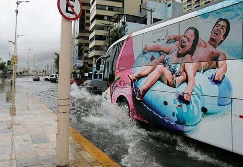 This bus is advertising a waterpark. It makes way through a flooded road. The picture on the bus coincides perfectly with the displaced water. And the end result looks something like the couple waterboarding across the street - and enjoying it.