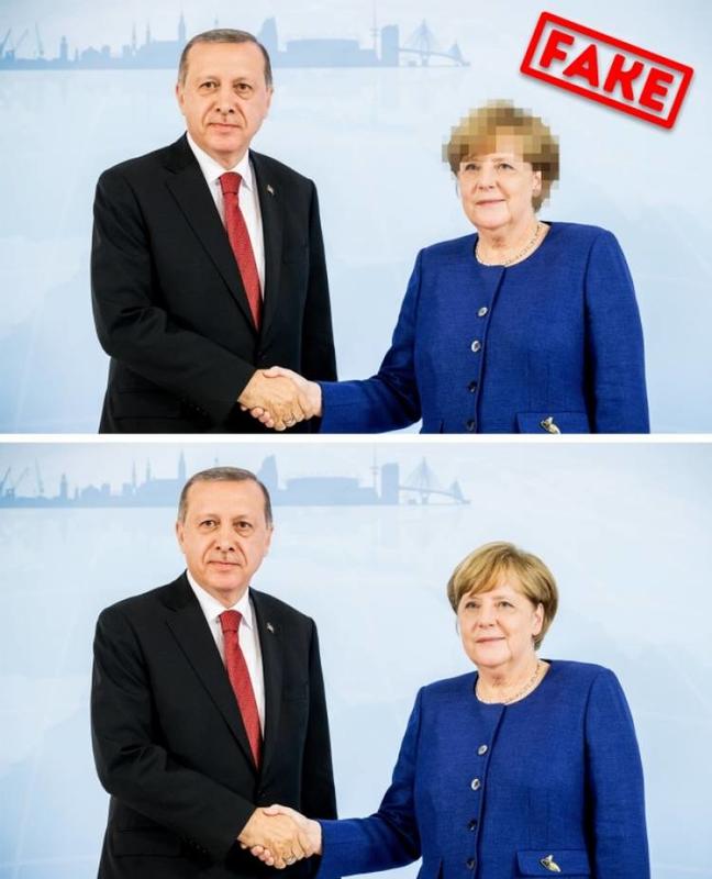 This picture of Angele Merkel became a viral item on the web when the supposed story was that Turkey didn't allow her hair to be shown on TV. This was obviously faked as the proper photo shows and further proof that the internet can never be believed.