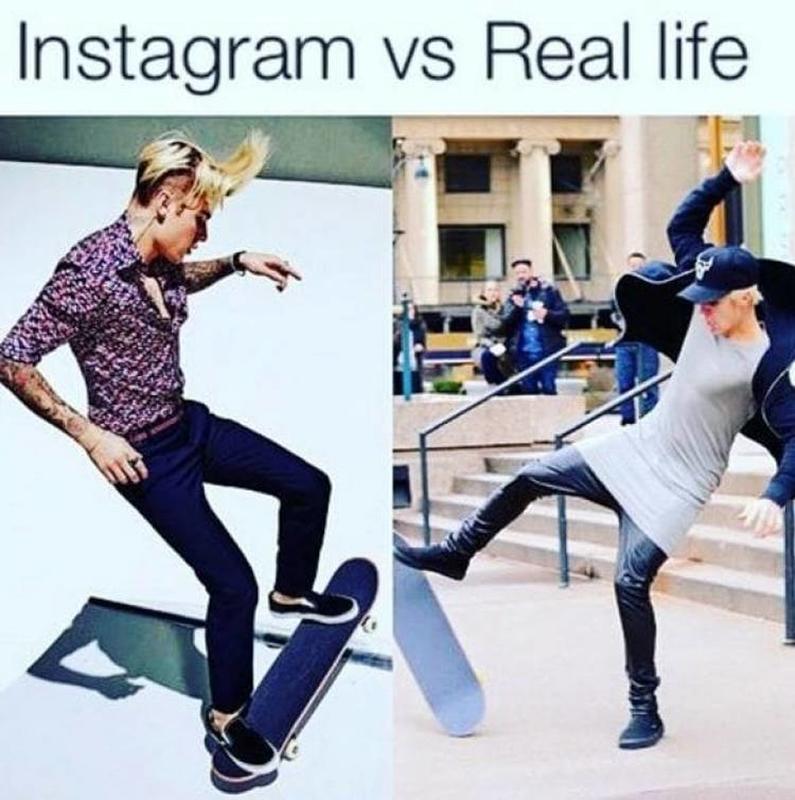 Here's a perfect example, the picture on the left is Justin Bieber skateboarding like a superstar on Instagram, but the photo on the right is a candid of the star failing at riding a skateboard in the real world. The perfect example.