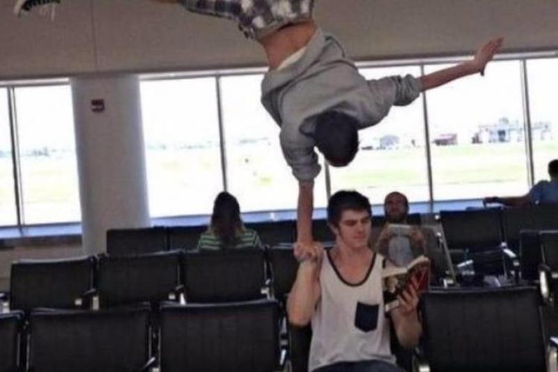 Imagine making your way to an airport departure lounge and seeing this. You'd instantly assume you'd walked in on the filming of a television show. When did these two men even find out they were strong enough to pull this off?