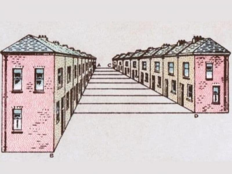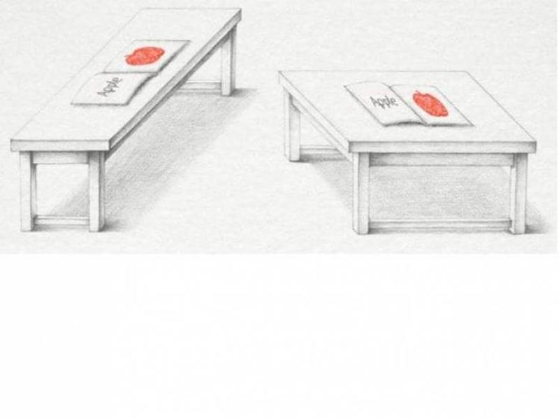 Which table is the larger one of the two? They're both the same but because the on the left is seen from a different orientation, it feels that it is larger. You can rotate the image and superimpose it to arrive at the same conclusion.