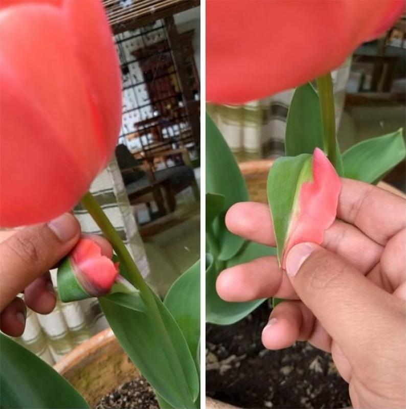 Tulips are one of the more beautiful flowers in existence, and what is even more interesting is that sometimes they can grow some pretty strange stuff. Like this tulip did - you can notice how one of its leaves is actually half-leaf and half-petal.