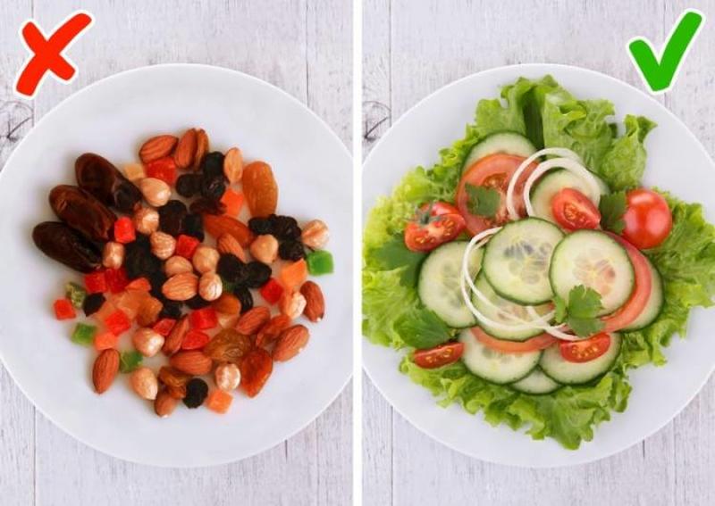 Rather than eating packets and handfuls of nuts during your time at odd hours, it is advised that you eat bigger meals that have more content and water in them. A plate of salad should always be preferred over a handful of nuts.