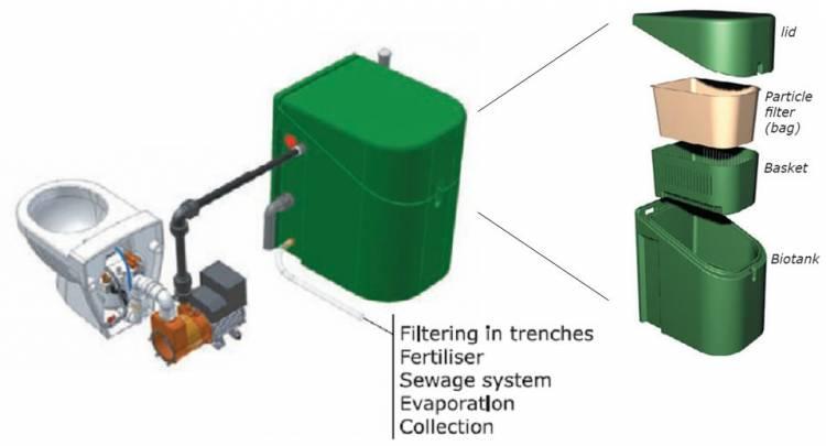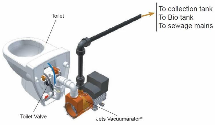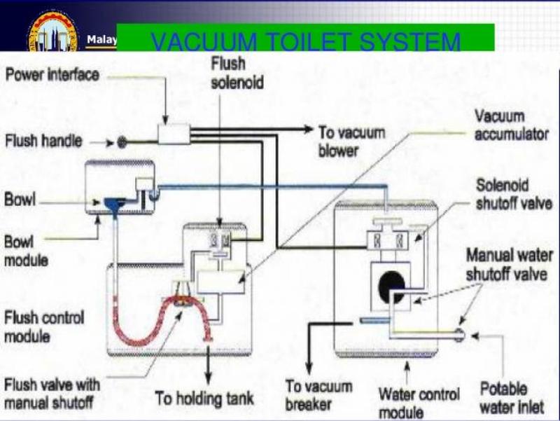 Once you press the flush button, the contents are exposed to a pneumatic vacuum. That pneumatic vacuum swirls the contents of the bowl (together with the blue liquid) into one of the tanks - this is called the "close waste system."