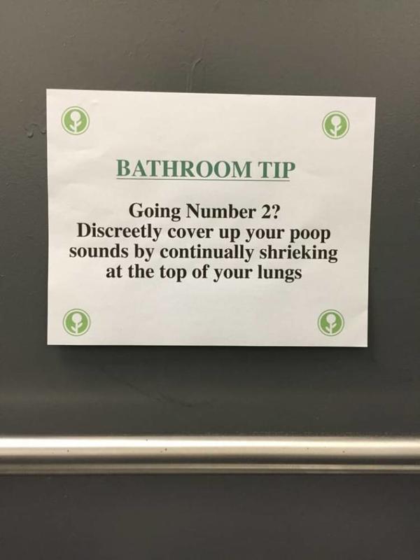 The ever ending quest to cover up the fact you have to go poo in a public bathroom. Most people discreetly disappear into a large stall for a couple minutes, others will detour home to make a quick stop. This suggests screaming at the top of your lungs, because yeah, then no one will know you are pooping.