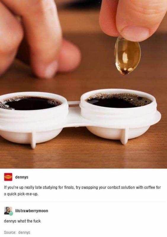 Denny's posted an interesting life hack about how to wake yourself up quickly. They suggested you swap your contact solution for coffee and dip your contacts in to give your a little pick me up. Don't. Do. This. To second the guy in the comments, "WTF Dennys"
