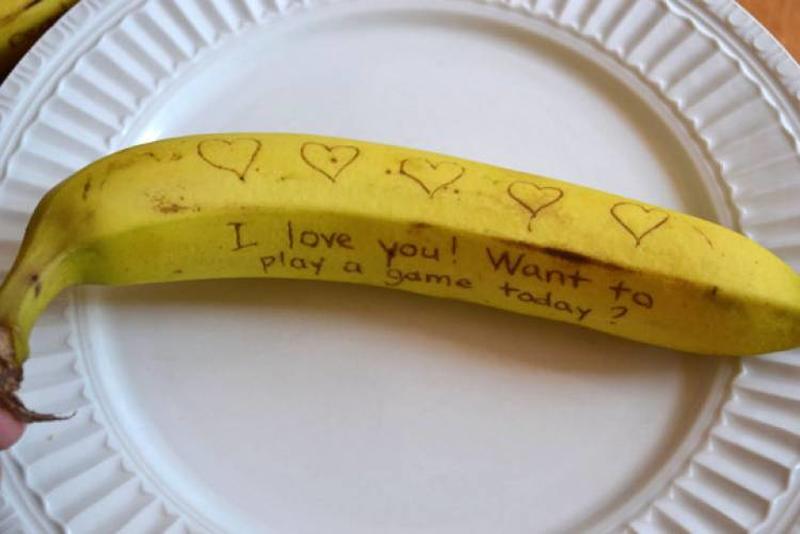 Perhaps you don't want to scavenge through your boyfriend's wallet - maybe he wouldn't like that. In that case, you do something crazy with his lunch box. One idea is to do like in the above photo - place a banana in his lunch box, and carve a loving message on the banana itself.
