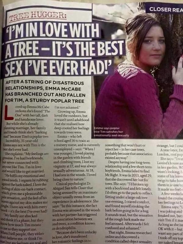 When it's love, it's love. I suppose that is true for most people. But for some, the things they try to pass off as love is interesting to the point of completely ridiculous. This women claims she is in love with a tree and it's the best sex she has ever had, I am going to say "nope."
