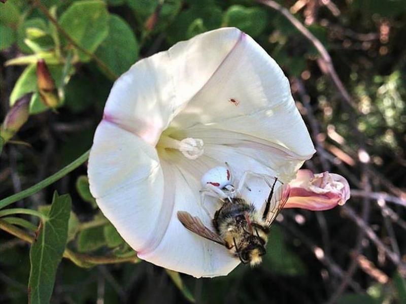 You ever wander around a park and just stare and marvel at how lovely all the flowers are? Makes you want to stop and put your nose in one of them and catch a big whiff. But be careful of bees, and be even more careful of camouflage spider eating bees!