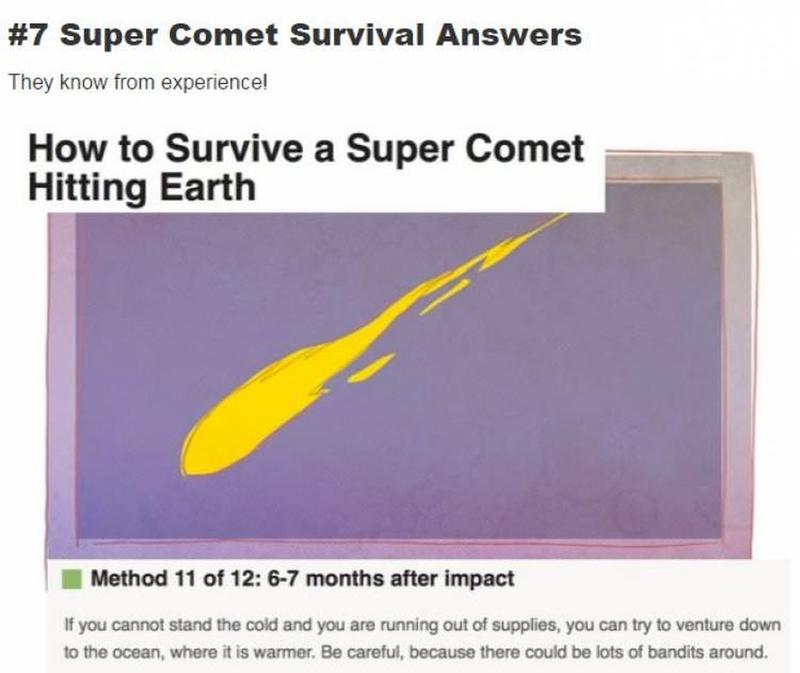 Being hit by a comet is one of the most likely ways how life on Earth would end. Everyone hopes that won't happen, and NASA is even preparing rockets as a defensive measure, but still, it is funny to think that someone could be planning their survival by reading a WikiHow article.