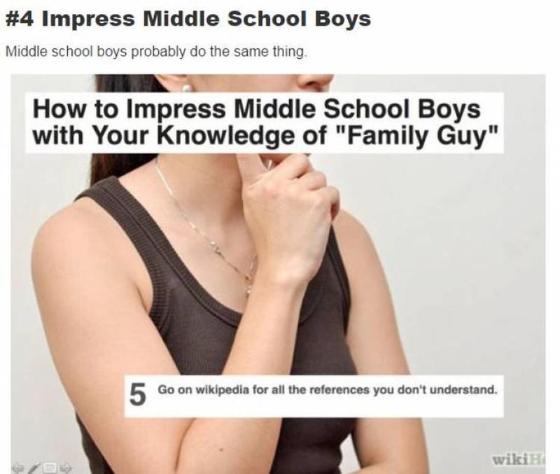 This is another question that no one needed an answer to - how to impress middle school boys? Hopefully this question has been written for middle school girls, otherwise, the situation is going to be much worse. The answer is centered on knowing "Family Guy" trivia.
