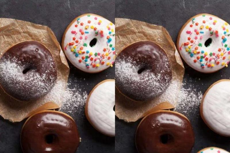 Doughnuts are simply awesome - which is what makes looking at this photo for the differences, so difficult without going out and buying an actual doughnut. This photo has seven differences - one difference is at the upper part of the bottom doughnut, and another difference is with the leftmost doughnut.