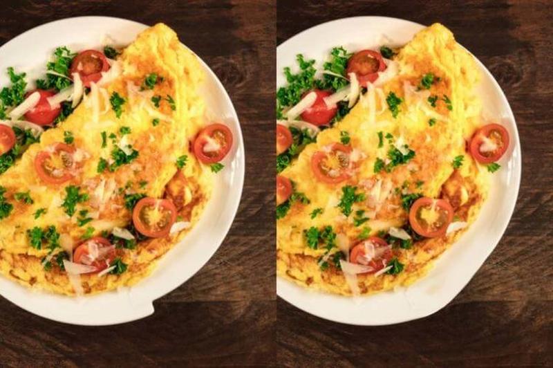 Omelet, and eggs, in general, are such a healthy food choice. That's what makes looking at this photo so pleasing. Anyway, if you have egg-cellent eye vision, you should easily spot the seven differences in these two photos. One difference has something to do with the tomatoes.