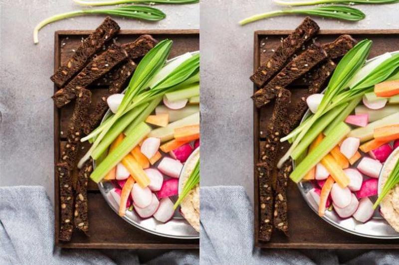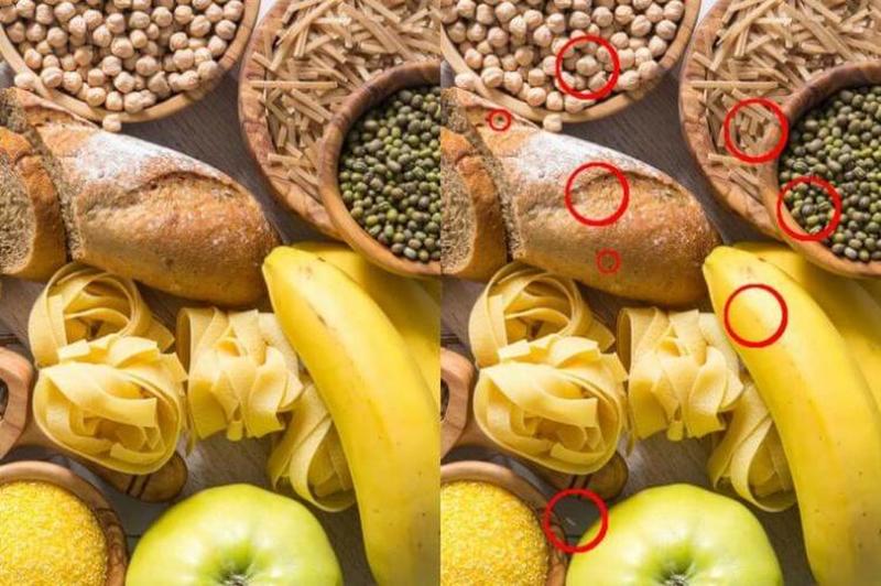 Here we have a photo of a variety of good products. There are 8 differences between the two photos, and you need to find as many of these differences in under a minute as possible. There is at least one difference in the peas bowl, and there is one nut missing from the bowl in the upper left of the photo.