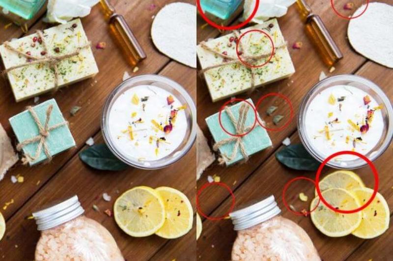 This photo has a far more equally distributed differences. There are two differences with the lemons on the right part of the photo; two with the little boxes on the left side and the rest of the differences are located on the table or other small bits and pieces.