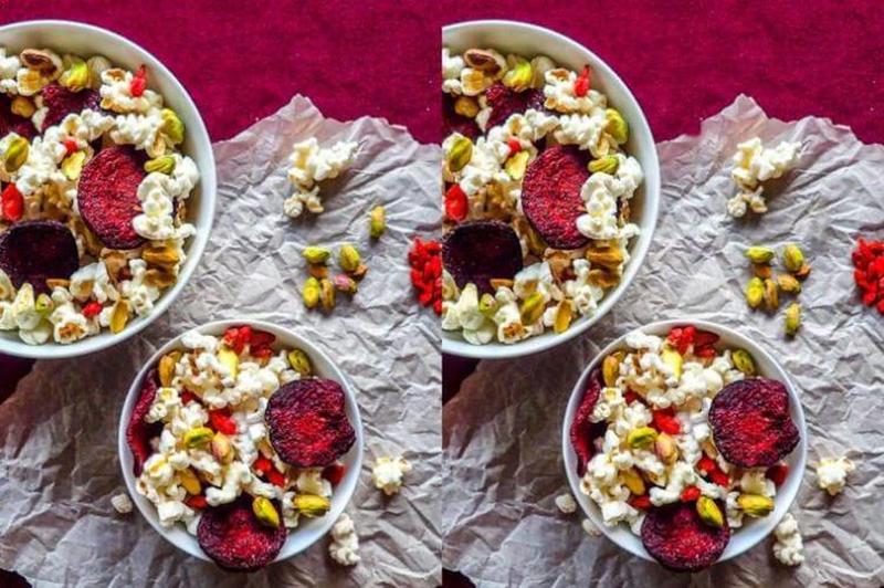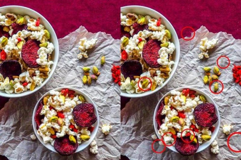 This puzzle has seven differences between the two photos. Can you spot them? To give you a few hints, there is one popcorn missing from the lower left part of the photo, and there is also one of the green nuts missing from the upper right part of the photo.