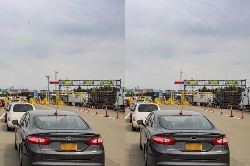 In this picture, the differences are mostly in the middle. They begin with the missing "ford" logo on the car that is nearest to the photographer, and continue upwards, ending with the plane or flock of birds in the sky (or perhaps it is Superman?)