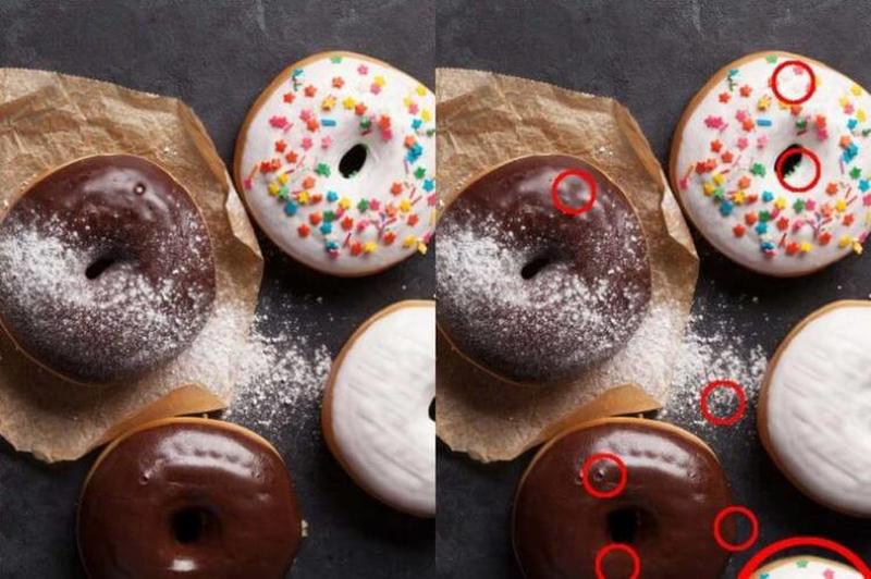 Similarly to the previous photo's solution, the doughnuts photo also has all of its differences located in the right part of the photo. Most of the difference are in fact located on the doughnuts, while there is only one difference on the table itself.