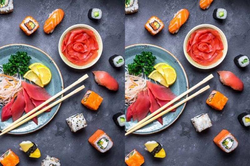 In comparison to the other photos in this story, the "sushi spotter" has nine differences in total. One difference that you can easily spot has something to do with the red meat in the dish, while most of the other differences have something to do with the little sushi cubes.