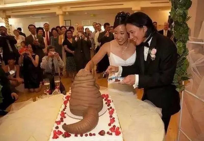 We've seen some rather extravagant wedding cakes in our day but never anything like this. From the initial glance at the cake, it looks like a steaming pile of human fecal matter but, the extended tail of the cake lets us know that this has to be some type of exotic animal or a Pokemon. Regardless, the couple looks happy so, congrats to them.