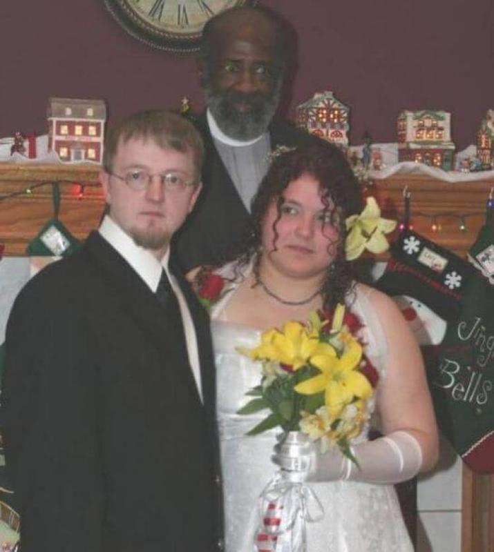 Not only does this holiday wedding appear to be going down what appears to be at someone's grandmother's house, the priest's presence in this particular wedding doesn't sit well with us. He reminds us of Samuel L. Jackson's character in Black Snake Moan. Maybe, he's conducting a shotgun wedding for these two as neither one of them seems to happy about their big day.