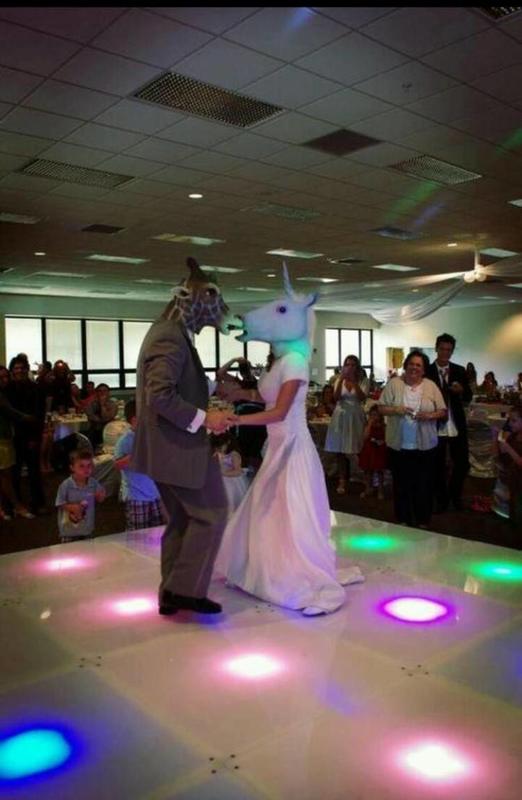 We're not exactly sure what's going on here but this might be the strangest first dance in wedding history. Who's ever idea it was to wear a giraffe and unicorn masks during such a precious moment is obviously a weirdo and this is giving us the vibe that these two must be into some kinky sh*t.