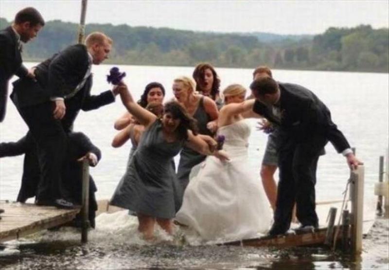 Murphy's Law... Whatever can go wrong will go wrong and this photo is the epitome of that. How in the world does a dock just break like this? This is why we refuse to take any risk when it comes to special occasions like these. Regardless, save the bride by any means necessary.