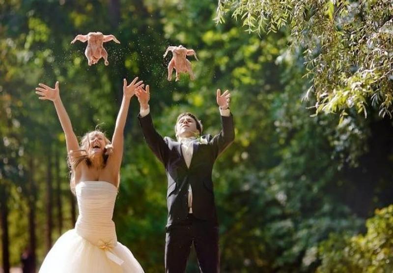 We're not sure exactly what's going on here or if this is some type of wedding ritual we've never heard of but, this is just plain weird if this newlywed couple doesn't own or run some type of business involving chicken. Who in their right mind would toss a raw chicken instead of a bouquet at their wedding? Salmonella for everyone sounds like a disaster.