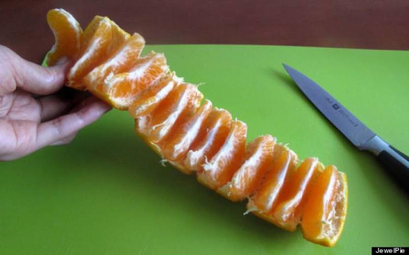 Most of us try to butcher oranges with our hands in order to reach the tasty insides. An easier way to peel oranges is to cut out the ends of the oranges and then slicing it down the middle - the result is much neater to look at.