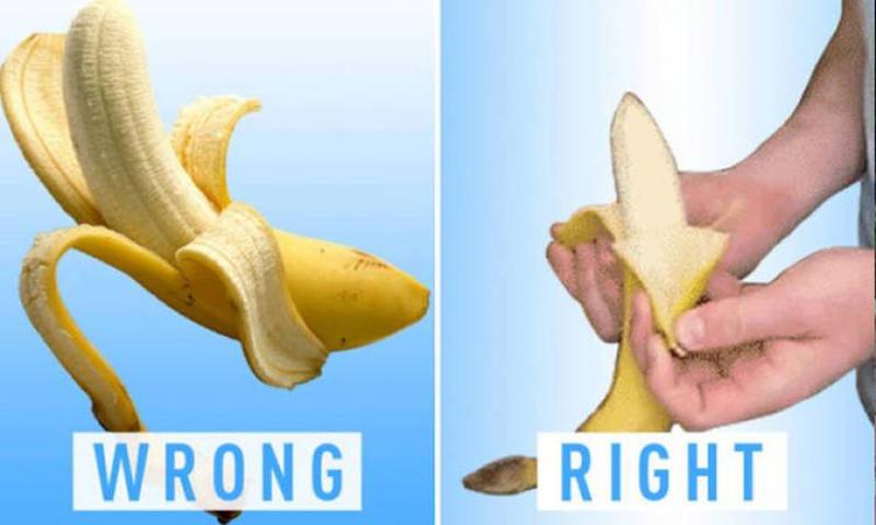 You're supposed to peel the banana from the stubbier end but we usually peel bananas from the top. Bananas peel better and easier that way. That's how monkeys do it - and that's how humanity should do it.
