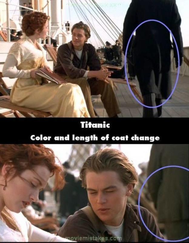 For some reason, moviemakers think that the extras in the background of a particular scene don't matter but, in reality, they really do. For instance, in this scene when Jack and Rose are having a conversation on the upper deck the gentlemen's coat's length and color changes as he walks past.