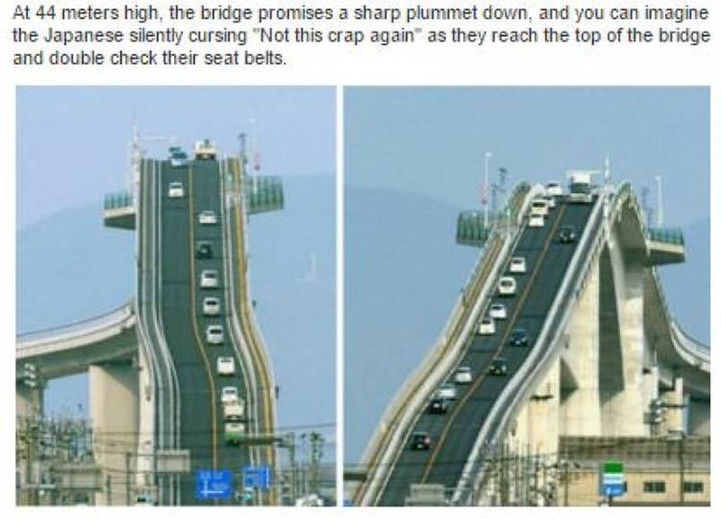 According to many people in Japan, this 90 feet monstrosity is one of the scariest bridges in Japan. Just imagine driving a car down this bridge - at that angle (which could be over 45 degrees), there is no way you could see the asphalt below you.