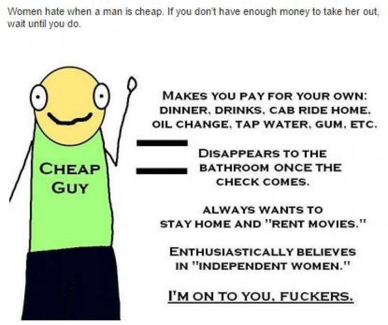 The above picture pretty much sums up how it is like being a "cheap guy." Just like needy guys hare a turn-off to most women, so are cheap guys. That is especially true for the beginning of the relationship when you still haven't set proper boundaries.