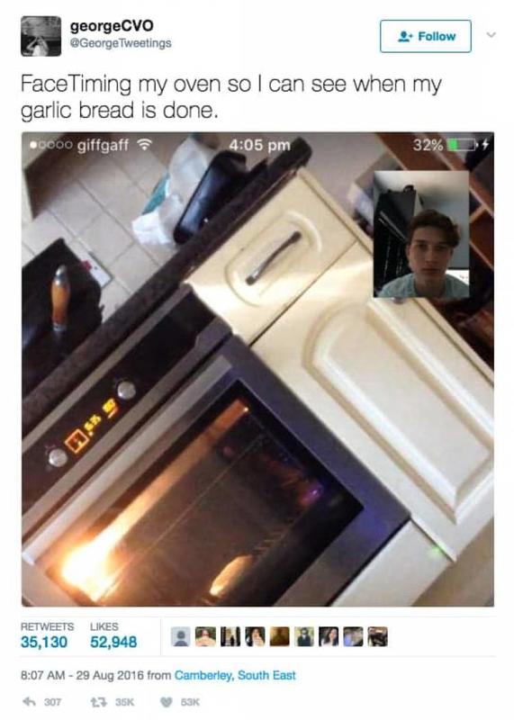 First of all, there aren't too many things in the world that can hold a flame to how important garlic bread is to us but, this guy Facetiming his own oven in order to make sure his garlic bread is perfectly toasted is one of the greatest and most responsible things we've seen in quite some time.