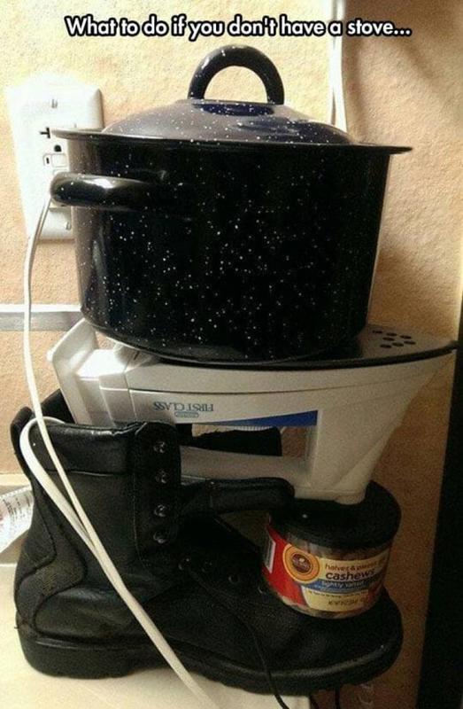Personally, we don't recommend that anyone try this at home for your own personal safety and because we're sure you guys have functioning stoves in your homes but we gotta admit that this balancing act is pretty impressive. Without a functioning oven, we're pretty sure there were ramen noodles in that pot.