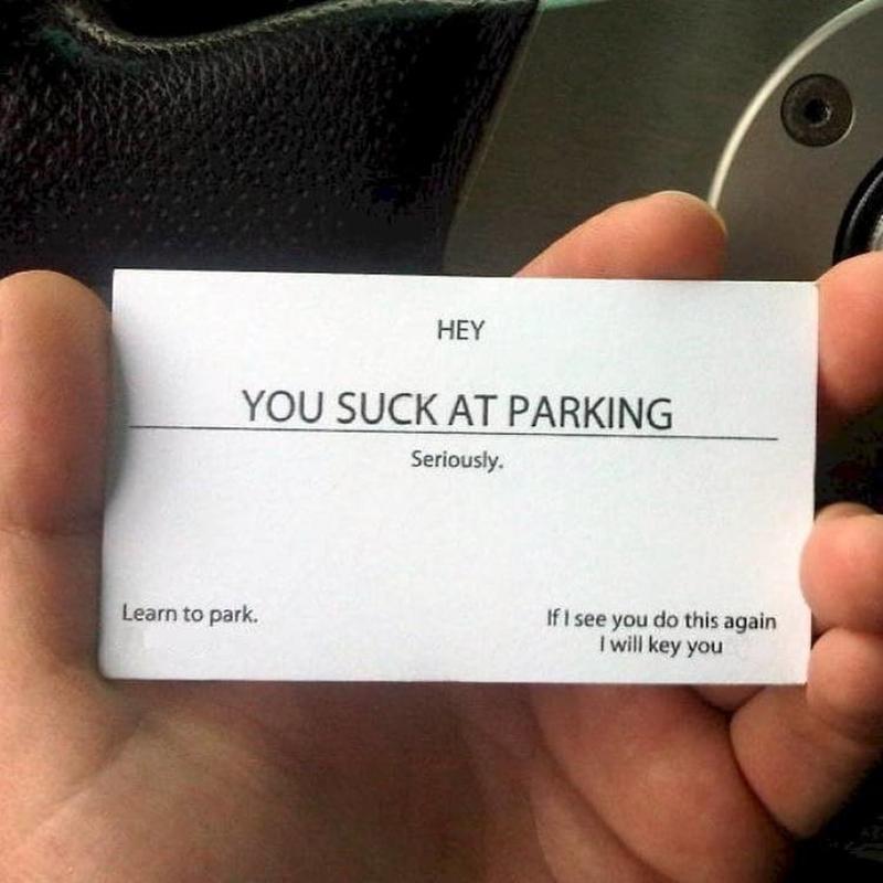 Honestly, business cards have become almost obsolete due to everyone being able to trade contact information via their cellular devices but, this is the type of business card that is absolutely necessary within our society. People, please learn how to park for our sanity and the safety of your vehicle.