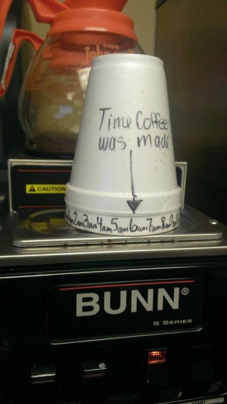 If you work in an office environment or have a coffee maker in the workplace that's constantly in use, use two styrofoam cups with the necessary labeling in order to avoid drinking old coffee ever again, of course, this method would require tactful individuals to play by the rules.