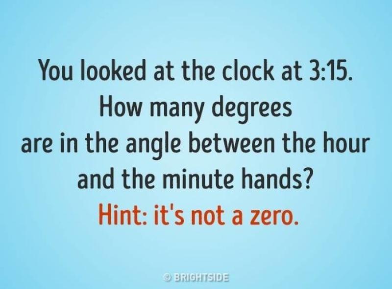This is isn't so simple. The clock is 360 degrees the clock hand turns through 30 degree each hour. To answer this question, the minute hand will exactly lie at three hours but the hour hand will be a quarter of the way between three and four hours. Hence 7.5 degrees.