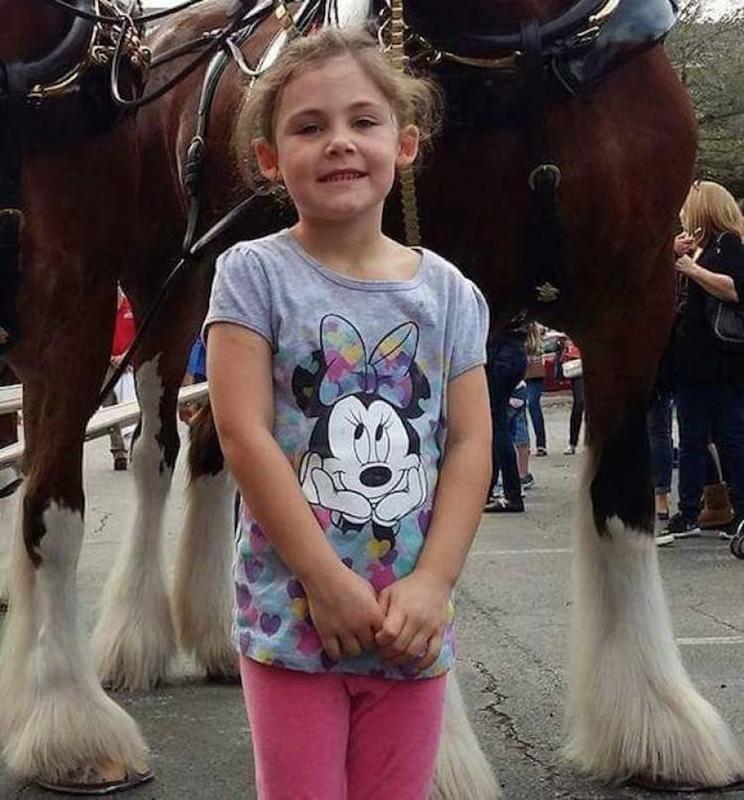 So the girl was enjoying an average day, spending time with her family in what was supposed to be a fun day out. They were watching large Clydesdale horses walk about in some sort of a parade and the girl posed for the camera.