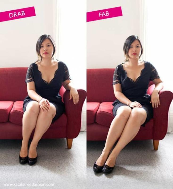 While you're sitting on a couch or a chair for a camera it is imperative that you don't sit with your legs straight and feet flat, while facing the camera. The legs should be slanted and your toes, not your feet, should be extended.