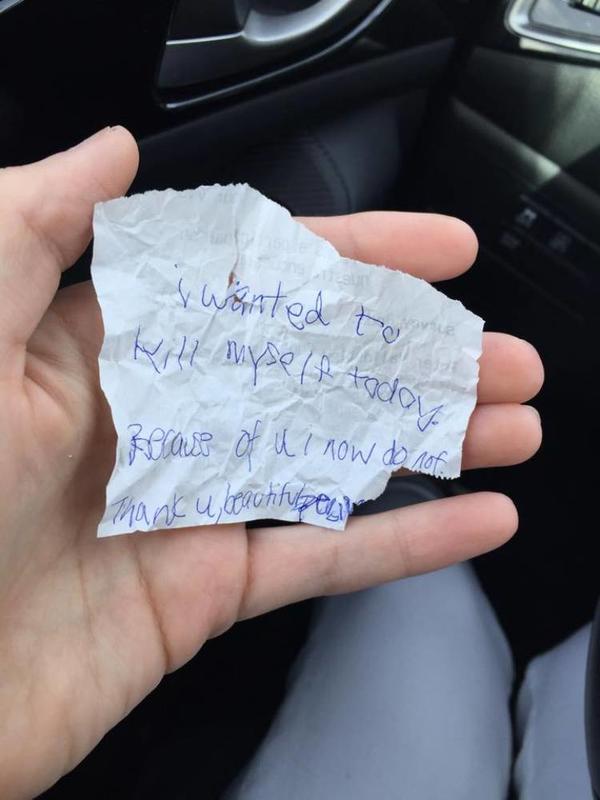 Casey was in a rush as she headed out of the doughnut shop, but when she had a moment she sat down and read his note. It read "I wanted to kill myself today. Because of u I now do not. Thank u, beautiful."