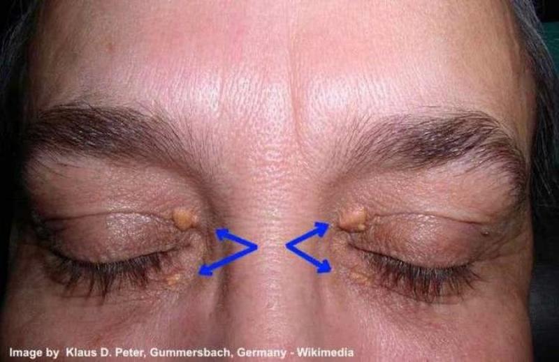 Xanthelasma is a sharply demarked and yellow-colored deposit of cholesterol (a type of fat) that piles up underneath the skin - in most cases, this happens on or around a person's eyelids. In some cases, they may appear sometime before a heart attack.