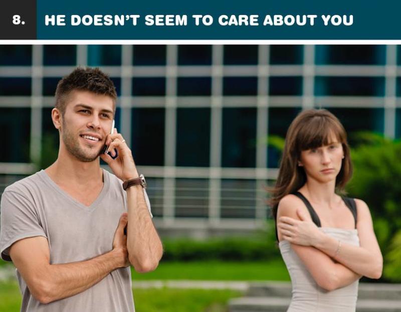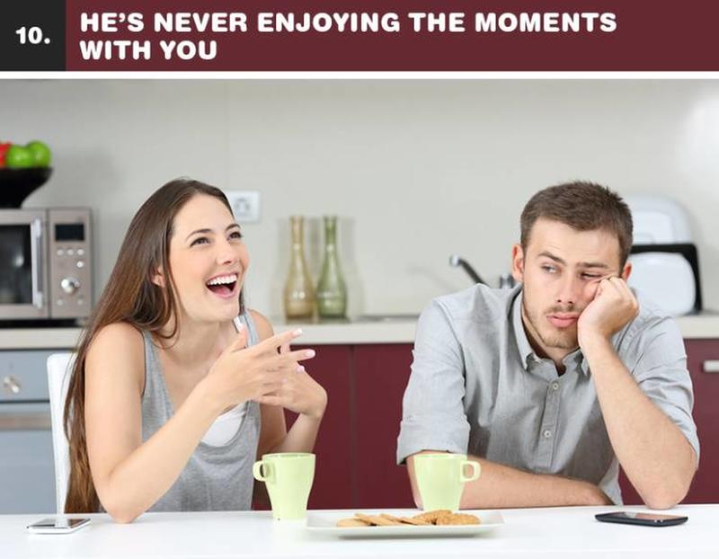 He never seems to enjoy the moment he has with you and is instead focused on other things that you have no clue of whatsoever. He doesn't care for your emotions and is never in the moments that you enjoy.