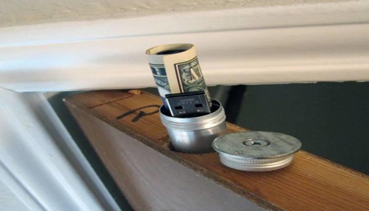 When a burglar breaks into your house, he's sure to look anywhere but here. Cut out a round at the top of your door, and place a metal tube in there. You can use this storage to store your precious items such as emergency cash, cheque, gold coins or jewelry, etc - basically, anything small.