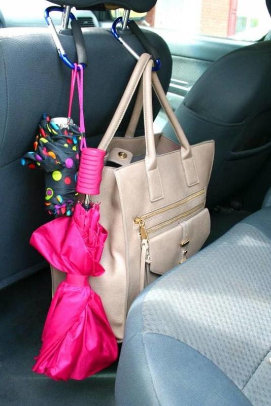 Clips like carbiner clips are perfect for holding stuff like purses, umbrellas and other accessories with handles to them in place. These clips are inexpensive and may give you a good value for the minimal amount you spend on them.