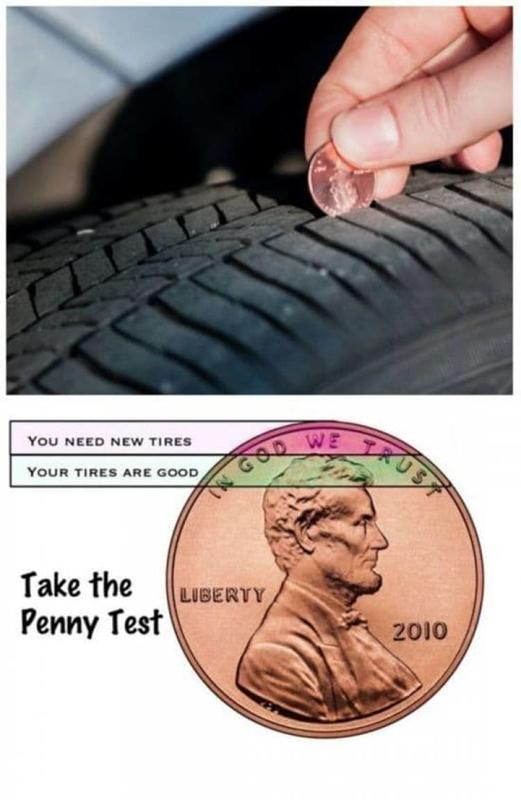 Always remember to take the penny test before heading out on a road trip. The penny test is a good indicator of what you can expect on the trip and will let you know whether you should change your tires or not.