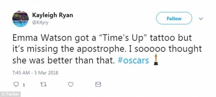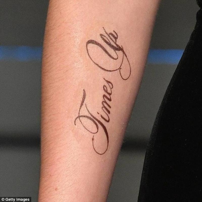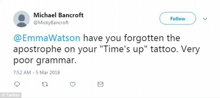 The thing that caused the greatest outrage was when people saw an enhanced image of the tattoo that Emma had gotten scribbled on her right forearm. The tattoo read, "Times Up". While the tattoo seems innocuous and pretty straightforward there were many people who straight away pointed out the mistake.