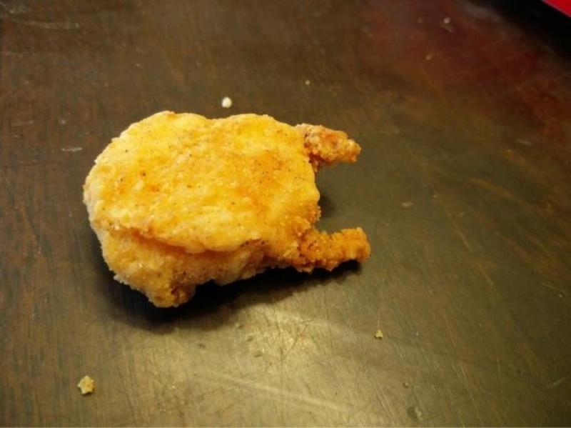 We do know how nuggets are made and that they have no resemblance whatsoever to the chicken that they come from, but this nugget here looks like a real chicken and we cannot control our excitement at this funny coincidence.